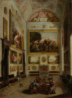 Die „musikalische Unterhaltung“ findet in einem kultivierten Ambiente statt, der hohe Saal mit der prächtigen Ausstattung lässt gar auf eine Residenz schließen, als wäre es ein Genre-Bild. Aber Vorsicht! Wir erkennen, dass die Musiker im Vergleich zur Architektur winzig sind. Schauen Sie, wie klein sie sich neben den an die Wände gestellten Polsterstühlen ausnehmen! Ihre Gesichter erkennen wir kaum, obwohl sie effektvoll vom hellen Sonnenlicht beleuchtet werden. Es wird musiziert – doch ohne Publikum. Tatsächlich scheinen die im Raum ausgestellten Kunstwerke wichtiger zu sein – zumindest nehmen sie den meisten Platz ein. Einige die übereinander gehängten Gemälde – riesige Historienbilder, Jagdszenen, Landschaften – wurden als Eigentum des Augsburger Bürgermeisters Jenisch identifiziert. Auch der Kabinettschrank an der Stirnseite sowie der Vogelkäfig samt Papagei gehörten Jenisch, der jedoch, auch das wissen wir, in Augsburg keineswegs in einem Palast lebte. Das Porträt einer Wohnung ist es nicht, auch kein Genrebild, denn die Menschen auf dem Gemälde erzählen uns keine Geschichte. Man könnte von einem Programmbild sprechen, in dem Schönfeld die Künste als Repräsentation von Macht und Reichtum feiert. In dem er gleichzeitig aber auch den Wettstreit zwischen den Gattungen eröffnet, mit der Frage, ob jetzt Malerei, Bildhauerei oder Architektur die größte Kunst sei – und ob sie sogar die Natur in der Gestalt des Papageis übertreffen? Oder ist am Ende die größte Kunst vielleicht doch die Musik, die Kunst des Augenblicks?