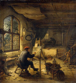 Ein Maler sitzt in einem rustikalen Künstleratelier, in dem Malutensilien, eine Gliederpuppe, Zeichnungen und Drucke, der Gipsabguss eines antiken Kopfes, Bilderrahmen und aufgespannte Leinwände liederlich verteilt sind. Wir können dem Meister bei der Arbeit an der Staffelei über die Schulter sehen, während im Hintergrund ein Gehilfe mit dem Anreiben der Farben beschäftigt ist. Etliche Atelierutensilien sind als Attribute eines „pictor doctus“, eines gelehrten Malers, auch symbolisch aufzufassen.