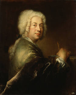 Selbstporträts, die den Künstler bei seiner Arbeit zeigen, sind gängige Motive im 18. Jh. Sie dienten häufig der Selbstvermarktung sowie der Demonstration des eigenen Könnens und des erreichten Ruhmes. So stellt sich Pesne nicht etwa in einem dreckigen Malkittel dar, sondern in edlem Gewand aus kostbaren Stoffen. An der zeichnenden rechten Hand trägt er einen großen Ring, der auf seine hohe Stellung als Künstler verweist. Selbstbewusst blickt der Maler den Betrachter direkt an.