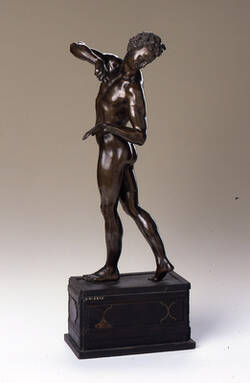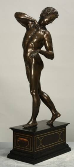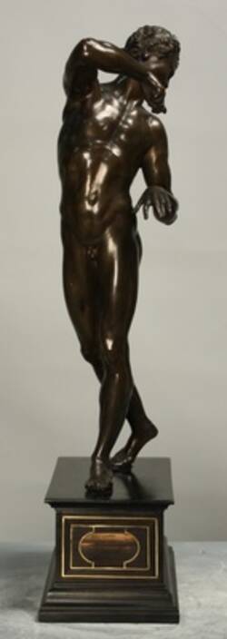 De Vries war der genialste Schüler Giambolognas und ein begnadeter Bronzeplastiker. Ganz im Sinne der manieristischen „figura serpentinata“ (schlangenförmig bewegte Figur) wendet sich der schlankgliedrige Faun in anmutiger Drehung um seine eigene Achse. Ursprünglich blickte er auf die Statuette einer Nymphe (1924 abgegeben), der die anzügliche Geste seiner rechten Hand galt. Als Vorbild diente vielleicht der nebenstehende antike Torso eines Satyrs, der sich im 16. Jh. noch in Italien befand.