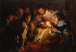 In dieser drastischen Darstellung einer Zahnoperation wird der Betrachter direkt mit dem dramatischen Geschehen konfrontiert. Einfache Landleute verfolgen den Vorgang mit Spannung, während einem von ihnen unbemerkt der Geldbeutel gestohlen wird. Großfigurige, bewegte Genreszenen in dramatischer Hell-Dunkel-Malerei und kräftigen Farben waren typisch für eine Gruppe holländischer Maler, die man „Utrechter Caravaggisten“ nennt. Auch Honthorst hatte während eines 5-jährigen Aufenthalts in Rom die Malerei Caravaggios kennengelernt.