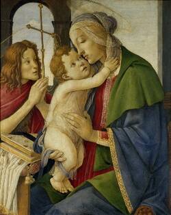 Ein charakteristisches Merkmal der Renaissance in Florenz ist die Vorliebe für die Linie. Die Betonung linearer Formen wurde als besonders schön empfunden. Einer ihrer berühmtesten Meister ist Botticelli. Das Andachtsbild zeigt Maria am Betpult, das Jesuskind auf dem Arm. Johannes der Täufer steht betend dabei.