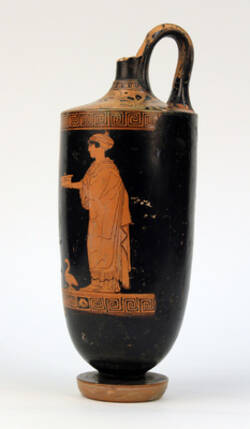 Diese hohen, schmalen Gefäße sind Lekythen; in ihnen wurde Öl aufbewahrt. Ihre Form beruhte auf einem standardisierten Schema und die Lekythen haben sich im Laufe der Zeit nur wenig verändert. Anders ihre Bemalung. Bei den ältesten aus dem 6. Jahrhundert vor Christus erscheinen die Figuren schwarz, später dann – durch die Umkehrung der Technik – rot, wie beispielsweise die Lekythos mit dem Mäanderband. Darauf übereicht eine Dienerin ihrer Herrin gerade ein Kästchen. Die sitzende und mit einem Diadem geschmückte Dame streckt ihr die Hände entgegen und hat den Blick auf einen Vogel gerichtet – eine Gans. Vielleicht wissen Sie, dass die Griechen die Gans der Aphrodite weihten, der Göttin der Liebe. Ist die Schatulle etwa ein Liebespräsent?