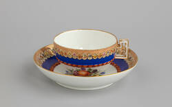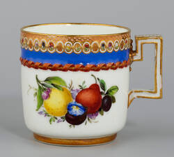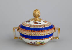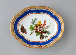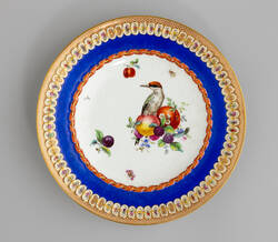 Das „Service mit dem Blauen Band“ war das letzte Tafelservice, das explizit für den Dresdner Hof gefertigt wurde. Namensgebend für das Service ist das stark leuchtende, breite blaue Band, das jeweils deutlich als verbindendes Dekorelement um die Gefäße oder die Ränder der Teller schwingt. Die Klarheit des blauen Bands, die medaillonartigen Kartuschen und dass um einen Goldstab gewundene orange-rote Band spricht die Sprache des Klassizismus. Die Malerei auf den weißen Flächen zeigt in naturalistischer Manier Blumen, Früchte, Vögel und Insekten der heimischen Tier- und Pflanzenwelt. Die Vorlagen dafür lieferte der Maler und Akademiedirektor Johann Eleazar Zeissig – genannt Schenau. Der Fokus des Dekors auf Flora und Fauna war sicherlich kein Zufall angesichts der großen Naturbegeisterung des sächsischen Kurfürsten Friedrich Augusts III.