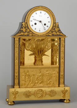 Bereits in der zweiten Hälfte des 18. Jahrhunderts hatte sich – zuerst in den Schlössern Frankreichs – der Kamin als Aufstellungsort von Uhren etabliert. Für diesen in der Wirkung eines Raumes sehr wichtigen Ortwurden besondere Uhren mit Denkmalcharakter entwickelt. Das Sichtbarmachen der technischen Konstruktionen des Uhrwerks rückte in den Hintergrund. Die Uhr war zum Anlass für eine Kleinskulptur in Augenhöhe geworden. Die Themen veränderten sich. Vor der französischen Revolution wurde die Zeit selbst thematisiert: Die Morgenröte, der Abend, die Jugend, die Vergänglichkeit. Die Napoleonische Zeit brauchte Helden, Götter, tapfere und treue Bürger*innen. Im zweiten Jahrzehnt des 19. Jahrhunderts wurden die Themen unverfänglicher – Darstellungen von Feierlichkeiten, Liebenden und Göttinnen der Fruchtbarkeit nahmen zu.