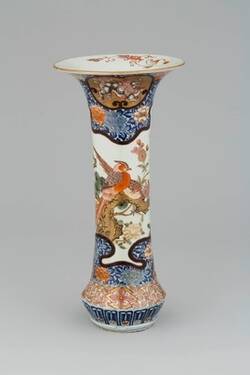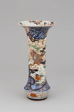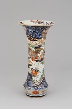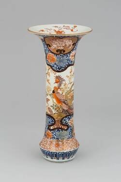 Solch monumentale Vasensätze mit üppiger Bemalung in Unterglasurblau, Eisenrot und Gold – dem typischen Farbklang des japanischen Imari-Porzellans – nahmen in der augusteischen Sammlung einen prominenten Platz ein. Sie zierten die Eingangshalle des Japanischen Palais. Die sehr aufwändig hergestellten Stücke wurden in den japanischen Porzellanwerkstätten eigens für den Export nach Europa gefertigt. Mit ihren überbordenden Dekoren entsprachen sie ganz dem Zeitgeschmack der Höfe im Barock.