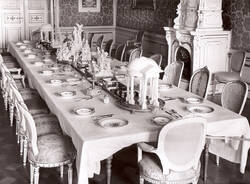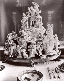 Diese Figurengruppe auf rundem Postament ist nur der Mittelteil eines großen, ursprünglich sieben Meter langen Tafelaufsatzes. Er war ein Geschenk an Kurfürst Friedrich August III. zu seinem 26. Geburtstag im Dezember 1776. Das Besondere an diesem Ensemble ist die Kombination von weißem Porzellan mit farbenprächtigen sächsischen Schmucksteinen. Die Hauptgruppe preist die wichtigsten Tugenden des jungen Fürsten: Fürsorge, Gnade und Wehrhaftigkeit. Die weiblichen Figuren auf dem Sockel stehen für die Künste, die unter seiner Regentschaft blühten.