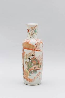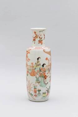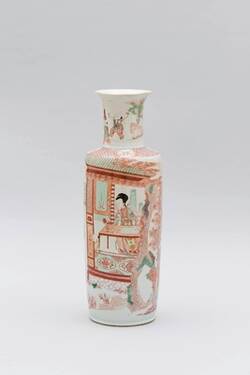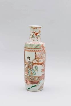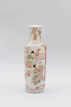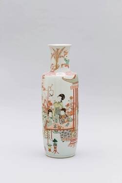 Diese drei schlanken, hohen Vasen entstanden zwischen 1710 und 1715 in China. Die mit feinstem Pinsel gekonnt und detailreich auf die Glasur gemalten Szenen geben einen Einblick in den streng nach außen abgegrenzten Lebensraum wohlsituierter Familien. Die elegante Kleidung und die Dinge, mit denen die Dargestellten sich beschäftigen, gehörten zur Welt hochgebildeter und vermögender Staatsbeamter der Kangxi-Zeit. Dass die Porzellansammlung gleich drei von diesen äußerst seltenen und qualitätsvollen Stücken besitzt, ist ein außerordentlicher Glücksfall.