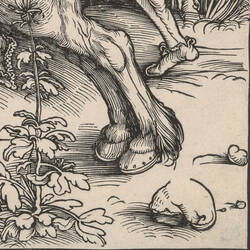 Albrecht Dürer (1471–1528) hat Bedeutendes für die Holzschnittkunst geleistet. Das Blatt „Reiter und Landsknecht“ entstammt seinem Frühwerk, offenbart aber bereits den an der Natur und zeitgenössischen italienischen Vorbildern geschulten Realismus, der seine berühmten, wenig später entstandenen Holzschnittfolgen „Marienleben“ und „Apokalypse“ bestimmen wird.
