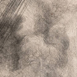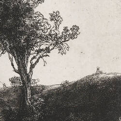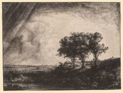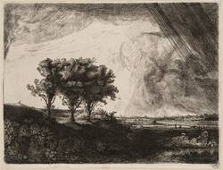 Rembrandt (1606-1669) nutzte für die Radierung „Landschaft mit drei Bäumen“ neben dem Ätzverfahren noch die Kaltnadel und den Grabstichel, den wir vom Kupferstich her kennen. Seine Arbeitsweise war viel freier als die seiner Künstlerkollegen, die sich in regelmäßigen Linien dem Kupferstich anzunähern versuchten. Um so lebendiger wirken seine Blätter. Mit dem Spiel von Hell und Dunkel verlieh er ihnen zudem einen malerischen Charakter.