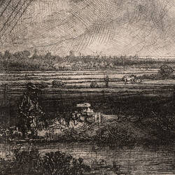 Das Blatt aus dem Jahr 1643 gehört zu den ersten realistischen Landschaftsdarstellungen Rembrandts. Es zeigt eine für die Niederlande typische flache Landschaft nach einem Gewitter. Sie ist reich belebt durch Tiere und Menschen, von denen man manche erst auf den zweiten Blick entdeckt, wie den kleinen Zeichner rechts auf dem Hügel oder das Liebespaar unten rechts im Gebüsch.