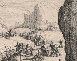 Jacques Callot (1592-1635) zählt zu den großen Radierern der Kunstgeschichte. Für seine malerischen und zum Teil bildgewaltigen Ansichten machte er sich die stufenweise Anwendbarkeit des Radierverfahrens zunutze. Denn schon nach wenigen Sekunden im Säurebad ergeben sich haarfeine Linien, die infolge ihrer geringen Farbaufnahme im Druck grau erscheinen. Für kräftige, tiefschwarze Striche musste oft mehrere Minuten lang geätzt werden.