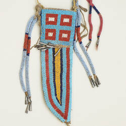 Eine lederne Messerscheide, die mit roten, blauen, weißen und gelben Glasperlen bestickt ist. Daran sind einige lederne Zierbänder angebracht, die mit Perlen bestickt und an deren Enden Konen aus gebogenen Weißblech-Kautabakdosendeckeln angebracht sind.