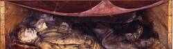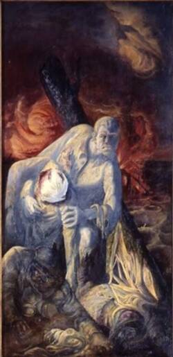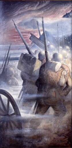 In stark, unsparing detail, Otto Dix presents an eternal cycle of horror. Soldiers march off to do battle in an apocalyptic landscape; those surviving drag wounded comrades out of the line of fire. Afterwards, they retreat into the trenches, lying in dugouts reinforced with boards where they sleep like the doomed. After a few hours, they make ready to be sent over the top again, and the nightmare begins again.
