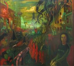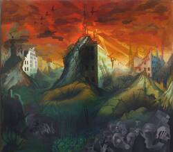 “A parade in a vast city which, with the blood-red sky above, seems to be on fire. People and masks have gone crazy, marching through the streets, deluding themselves and others. Solely in the left-hand corner, the communists are still standing, unwavering and steadfast.”
