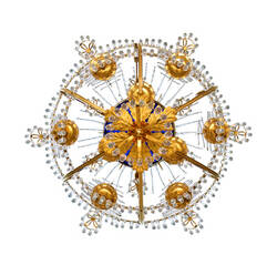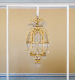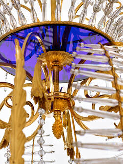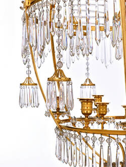 The records indicate only one chandelier for all the Emperor´s rooms. Unfortunately, the original documented chandelier can no longer be identified. Instead, a very worthy replacement was purchased. The chandelier with its nine candle cups is a good example of the extremely imaginative design of chandeliers around 1800 and was produced by the Chursächsische Spiegelfabrik, or the Electorate of Saxony Mirror Factory. Both in terms of design and technology, the piece is of outstanding quality: its unconventional basket or egg shape is special, even for the period of early neo-classicism. The interplay of the frame made of gilded bronze with the richly varied, Bohemian glass hangings testifies to the high level of Saxon craftsmanship of the time. The Chursächsische Spiegelfabrik in particular was one of the leading Central European manufacturers of brass-mounted glassware and chandeliers around 1800. You are looking at a masterpiece of Saxon neo-classicism.