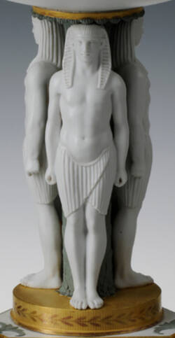 As the so-called Apis-Altar by Johann Melchior Dinglinger (Grünes Gewölbe) impressively demonstrates, there was already a pronounced interest in the culture of Ancient Egypt well before 1800. However, with Napoleon’s Campaign in Egypt (1798-1801), which was also joined by numerous artists and scholars, it expanded into a pan-European phenomenon that also affected the porcelain production. The service that Napoleon himself commissioned from the manufactory in Sèvres as a gift for Tsar Alexander I is world-famous. A second service - with scenes based on the richly illustrated travelogue by Dominique Vivant Denon printed in 1803 - was created a few years later for his wife Joséphine de Beauharnais. However, due to her disapproval, it later made its way to England and inspired the Wedgwood manufactory there to produce further “Egyptianising” items. Egyptomania did not stop at Meissen either, as illustrated by a service from the Marcolini period now preserved at the National Museum of American History. In Saxony, however, only few testimonies to the enthusiasm for Egypt have survived, which underscores the importance of the present centrepiece. Created around 1820-30, it is the sole survivor along with another example now in private hands.