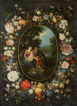 The first frame is from the work Holy Family in a Wreath of Flowers by Frans Francken and Jan Brueghel in the Gemäldegalerie Alte Meister. The second frame is from an eighteenth-century Iranian manuscript.