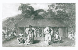 The captain, his escort officer James Burney and the nature draftsman Georg Forster themselves took part in the Hiwa dance of the "beautiful Poedua", the daughter of a high-ranking aristocrat Raiatea (ari'i nui), at an arioi festival in September 1773. Forster noted about her Hiwa costume: