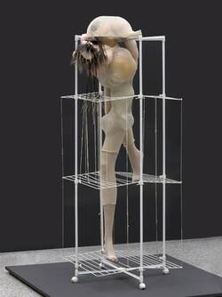 "All of my art has a sexual connotation. Art that doesn’t have this has no reason to exist. I come at it from many directions, and so my work must tease, satisfy, and suffer, and provoke feelings of guilt in the person who views it." This is how Madeleine Berkhemer describes her artistic drive. In the mixed material sculptures typical of her oeuvre, but also in her performances, photo collages, and drawings, she breaks the female body down into its individual parts, stretches it out in space, and creates sensual and at the same time uncanny fleshy structures. In the process, she plays a humorous game involving materials – such as the tights used here – and colors that have female connotations, drawing on the defamiliarization of the body as explored in Surrealism. In this way, Berkhemer appropriates the sexualized, voyeuristic, and pornographic gaze from a feminist perspective.