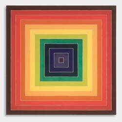 In the late 1950s, Frank Stella gained renown for his Black Paintings: strictly geometrical works showing black stripes identical in width. Later, the monochrome black would yield to a brightly colored palette, although his pictorial compositions retained the same rigor. Among these works are the Concentric Squares. Deviating markedly from the loose gestures of Abstract Expressionism, the strict pictorial composition of Stella’s paintings of this period follows a rigid rulebook. His "hard edge painting" offers no narrative, no interpretative leeway. With the statement, "You see what you see," Stella rejected any metalevel. Yet with the close attention paid to the act of seeing, the stringent paintings shine a light on the human being and thus on living perceptive processes. In the act of viewing, the supposedly objective expressive power of pure color becomes relative and inconstant.
