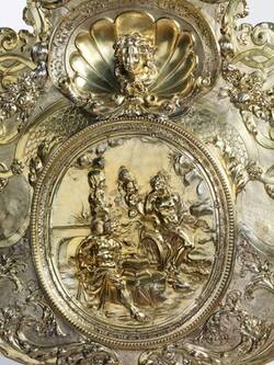 The suite of silver-gilt furniture served the same purpose. It consisted of the pair of tables, the four guéridons, the two wall sconces with mirrored glass, and finally the spectacular fire screen. In combination, they also formed a strong counterweight to the silver gilt pilasters on the walls while also serving as a perfect complement.