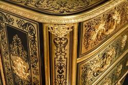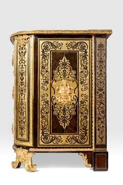 A great deal of technical skill was required to produce tortoiseshell and brass veneer. The same holds true for the elaborately tooled three-dimensional brass mounts, which required a complicated production process. They were generally finished with shockingly expensive fire gilding, which guaranteed a permanent gold sheen.