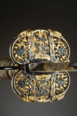 This set is special, because it was made in what’s known as the elaborate shakudō technique, which was developed in Japan. It features a characteristic colour palette of black and gold. The raised areas of black display typically Japanese motifs: branches bearing blossoms, landscapes, birds, and three-dimensional dragons’ heads.