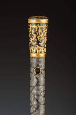 Exotic materials were used for the covers of both the cane and the sheaths. They were made from the skins of sharks and rays. The ornamental patterns were achieved by a skilful blend of decorative polishing and urushi lacquer. The familiar European forms of the cane, sword and hunting-dagger were combined with striking and alien Japanese designs, which turned these items into sought-after fashion accessories. The set is thought to have been a gift from the Russian Czar Peter the Great to August the Strong.