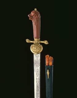 Take the hunting hanger on display in this showcase. The grip is carved from amber and represents the head of an imaginary sea-creature resembling a dolphin. The two small utility knives also have tiny imaginary heads carved from amber. The hunting hanger was a gift from the Prussian King Friedrich Wilhelm the First to August the Strong during the latter’s visit to Potsdam and Berlin in 1728.