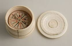 - Ivory turned and shaped on a lathe; compass dial: cut paper, painted, iron; ring: brass