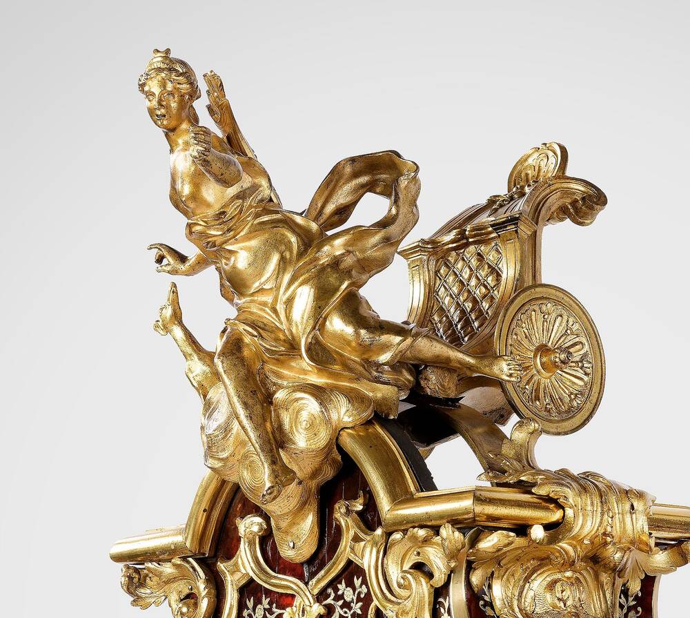 The model of the Pendule aux biches, a clock resting on the backs of four sculpted does (French: biches) and crowned by Diana, goddess of the hunt, on a high pedestal, is one of the outstanding creations of 18th-century Parisian cabinetmaking. The model is believed to have been designed by the Parisian cabinetmaker Bernard I van Risenburgh (BVRB I; 1670–1738), who came from the Netherlands. This attribution is based on an entry in his death inventory from 1738 for a ‘model of the pedestal and clock case on a doe’. The fact that Latz also produced this clock model is attested to by a pendulum clock in the collection of the Prussian Palaces and Gardens Foundation Berlin-Brandenburg. It bears the stamp of the Latz workshop. These two Dresden pieces are likely to be a kind of link between the production of BVRB I and the pendulum clock stamped by Latz in Potsdam.