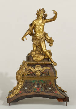 Until the Second World War, the pedestal and the top of the clockcase formed a set of so-called Apollo pendulum clocks on pedestals with rosette fittings, which was displayed in the so called Kleine Ballsaal in the Residenzschloss. Originally, there were four sets of this clock model. Two were covered by a marquetry with a tortoiseshell base (so called Boulle marquetry in première partie, plus track 6207) and with a ground made of brass (contre partie) and coloured inlays. The quartet was purchased in 1768 from the estate of Count Brühl. The coloured pair was separated in 1925 when, in the course of the settlement with the former Saxon royal family after its abdication following the First World War, works of art were also submitted. The pieces exhibited here belong to the ensemble that remained with the Free State of Saxony.