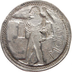This stater (the term means something like "uniform piece") is from the first phase of coining in Poseidonia. The artistic quality is especially high, because it shows the sea god Poseidon as a complete figure – the first time in the history of Greek die-cutting that that had been achieved.