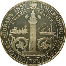 The message is easy to identify if you look at the coin. In the centre is the Trieste lighthouse with flags flying from it. It's flanked by a steamship and a locomotive, symbolising the economic upswing. Below them are the coats of arms of Vienna and Trieste respectively, to identify the beginning and end of the railway route. The double thaler bears witness to the engineering advances that were so important to the country's economic development.