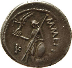 As you can see on this denarius struck by the moneyer Marcus Mettius. Caesar was the first living Roman to be honoured in this way. On his head, he's wearing the gold wreath of honour awarded to him. The augur's staff and bowl symbolise his consecration as augur and pontifex maximus. The reverse shows the goddess Venus – from whom Caesar claimed his family was descended.