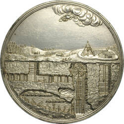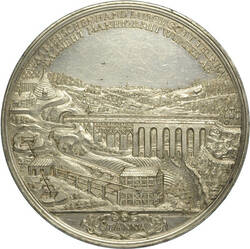 On the obverse, you can see the Altväter Bridge. It was a major engineering achievement of its day, erected between 1653 and 1689 in Rothenfurth not far from Freiberg. The bridge, which has not survived, was originally an aqueduct carrying the Münzbach stream across the Mulde river valley. The water was needed to power the machinery. The obverse shows the mining complex above ground, while the reverse shows the underground workings.