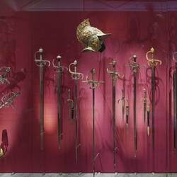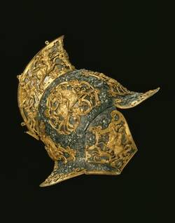 The date 1599 and the information that the armour was purchased from a source in Augsburg confirm its provenance as southern German, but they don’t tell us who made it. For many years, this precious armour was ascribed to the Augsburg craftsman, Desiderius Colman. The Mannerist profusion of decoration in a strictly organised composition suggests that it could have been made by the Colman family of armourers, whose last great master craftsman was indeed Desiderius. However he died in 1578, so he couldn’t have been the maker. Furthermore, there was no Colman school, as had been thought for many years. So we simply don’t know who created this splendid piece – nor even if it was a goldsmith or an armourer, a single master craftsman or the members of a workshop.