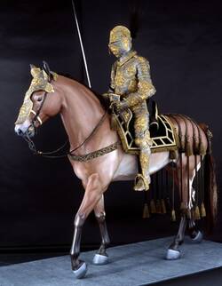The Rüstkammer Inventory of 1606 contains the following entry on page 175: “A beautiful suit of armour of embossed metal, partly gilded, . . . worn by my gracious lord, Elector Christian (II), together with a pile helmet, back, breast, collar, spangerol, vambraces, gauntlets, . . . poleyns, complete greaves, chanfron, saddle armour and a pair of stirrups, purchased from an Augsburger for the Rüstkammer on 23 September 1602, and placed on the horse in 1603 . . . , including a black velvet skirt trimmed with gold trimmings, made in 1602.”