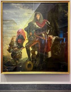 The Elector commissioned it from the Dresden court armourer, Christian Müller. It is made of chased iron that has been blackened; the rivet heads are brass. The lining of the helmet and the protrusions are red velvet. You can see this suit of armour twice in the Riesensaal: once, here in the display case . . . and again, directly behind the display case, in a painting by Johann Fink. Johann Georg II deliberately chose not to have his portrait painted in ceremonial armour, but rather in battledress. For this special occasion, however, the armour is decorated with a lavish plume and Johann Georg is wearing his Elector’s velvet cloak. In this full-length portrait the Elector exudes energy and has one foot resting boldly on a cannon.