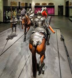 The armours here are just some of the gleaming or blackened tourney harnesses that the Electors August and Christian I commissioned for noblemen taking part in their tournaments. Unfortunately the Dresden Rüstkammer collection has no original tournament clothing. For this reason, the garments worn by these figures were specially made – with the greatest care – for this tournament group.