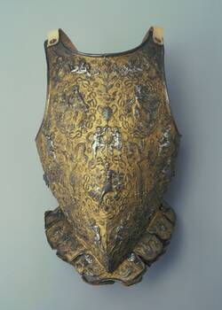 The ceremonial armour you see here was originally not only gilded and covered with raised figures, symbols and foliage, it was even decorated with coloured enamels. The inventory of 1615 includes the following entry: “A beautiful gilded cuirasse of embossed metal with all kinds of beautiful, raised, coloured pictures and fruits. . .”