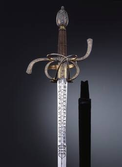 The main exhibit in this display case – No. 6 – is a rapier from the early seventeenth century. The guard has gold inlays and is decorated with curvilenear ornamentation, foliage, and a string-of-beads design, as though the hilt and cross-guard were covered with a fine fabric. The blade was made in the German town of Solingen. The craftsman can be identified by his mark, a king’s head. It was Johannes Wundes, a cutler who was famous throughout Europe in his day. The rapier blade bears an inscription in a beautiful inlay: “Love the truth and fight chivalrously for the Fatherland.”