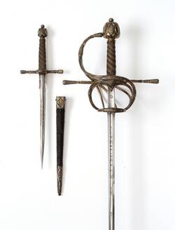 The blades of another rapier-and-dagger set displayed here were also made in Solingen. They have been ascribed to the master craftsman, Peter Wersberg.