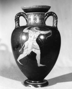 Immediately after shooting an arrow, Heracles also prepares to strike with his club. However, the matter is already settled: the back of the amphora shows that the Thessalian bandit Cycnus, who had challenged Heracles to a duel, has already been fatally wounded by the arrow and has collapsed.