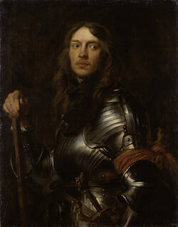 This half-length portrait depicts a young man in armour; with his body turned to the right, his eyes gaze past the viewer with an air of pride. He wears a red armband, which identifies him as a high-ranking military officer. The polished black armour with its silvery light reflections contrasts dramatically with the red fabric of the armband, attesting to the painterly elegance and delicate execution of this work. The picture was painted in Italy, where Van Dyck became a successful portraitist.