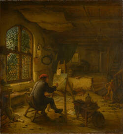 A painter sits in a rustic artist’s studio, where painting utensils, an articulated mannequin, drawings and prints, a plaster cast of an antique head, picture frames and stretched canvases are scattered about in a disorderly manner. We can see over the artist’s shoulder as he works at the easel, while in the background an assistant is busy grinding the paints. Several of the studio utensils can also be understood symbolically as attributes of a “pictor doctus”, a learned painter.