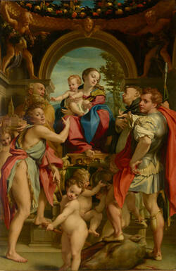 This altarpiece was created for the Fraternity of San Pietro Martire in Modena. The main saint, to the right of the throne, is speaking to Mary. In front of him is St George. Some putti are playing with the weapons he used to kill the dragon. On the left, John the Baptist points to the infant Christ, to whom Bishop Geminianus is showing a model of Modena. All figures are engaged in lively interaction. Their emotionality and the affectation of their poses testify to the new age of Mannerism.