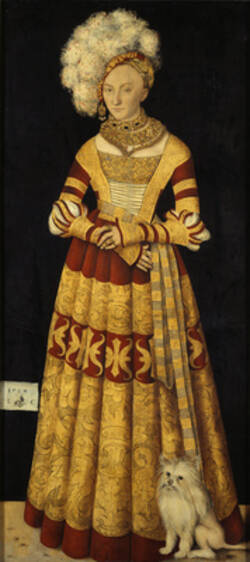 Cranach painted his first portrait of Duke Heinrich in 1514, in the prestigious wedding portrait alongside his wife Katharina of Mecklenburg. These portraits are the earliest life-size depictions of secular rulers. The rich, gold-embroidered garments testified to their high social status. Heinrich acquired his sobriquet “the Pious” on account of his pilgrimages to Jerusalem and Santiago de Compostela. In 1537 he introduced Luther’s Protestant doctrine to his Freiberg territory.