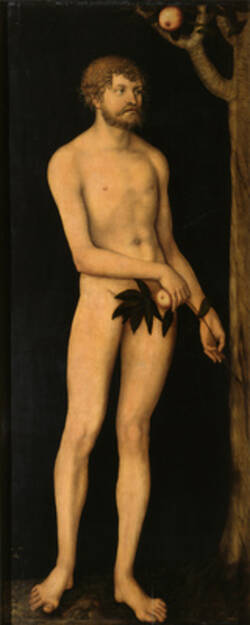 The paintings of Adam and Eve can be divided into two types – first, with the figures against a monotone dark background and, second, against a landscape. Our collection includes both these versions. Yet the different versions share many common features. Adam and Eve are nearly life-size, slim, and look remarkably similar. They are also all painted on limewood panels around 170 centimetres high. Moreover each panel always has the cropped trunk of an apple tree on one side as a connection to its companion. And in both versions, the cunning smiling snake has already reached it goal – Eve has plucked the forbidden fruit from the Tree of Knowledge, has bitten into an apple and, with her right hand, holds it out to Adam. In the biblical account of the Fall of Man, as this is known, Eve has the active role. When they taste the fruit of the Tree of Knowledge, Adam and Eve realise they are naked and cover their loins with leafy twigs.